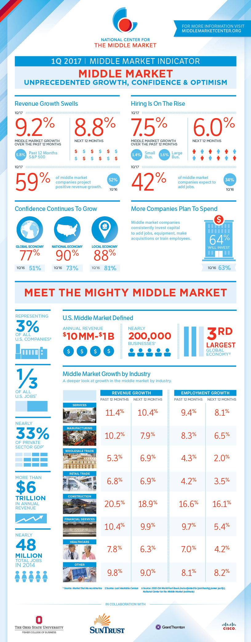 The infographic of the 1Q 2017 Middle Market Indicator illustrates the state of revenue and employment growth, confidence and capital investment plans of the middle market in the first quarter of 2017. Actual and projected revenue and employment growth rates continue to rise significantly, and economic confidence is keeping pace, with all measures at their highest levels since the inception of the Middle Market Indicator in 2011.